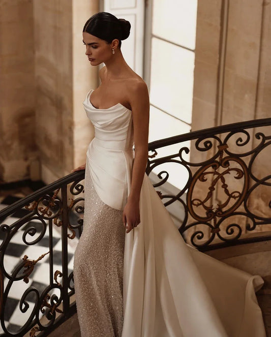 Customized Simple Strapless Mermaid Wedding Dress Shiny Sequin Beading Satin Detachable Train Pleat Bridal Gown Vestido De Novia