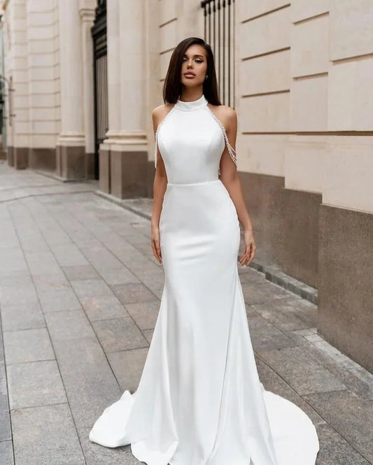 Simple Customize To Measures Mermaid Simple Satin Wedding Dresses Halter Sleevless Beading Bridal Dress Backless Long Wedding