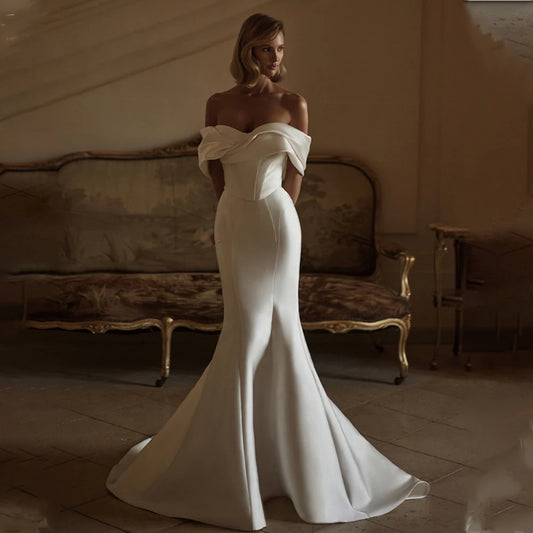 Customized Simple Satin Mermaid Long Wedding Dress Sexy Off Shoulder Formal Pleat Boat Neck Vintage BacklessZipper Bridal Grown