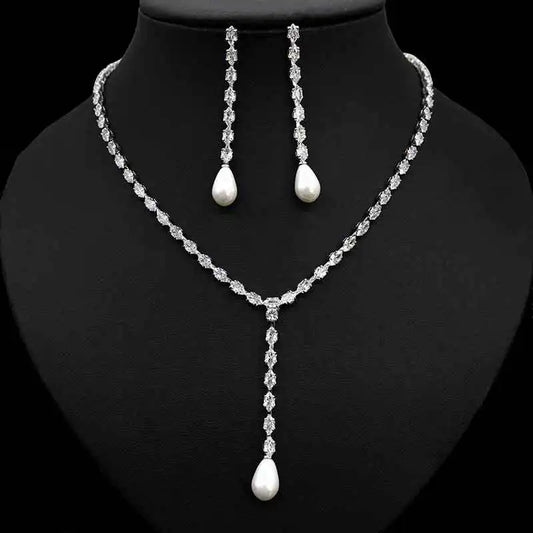 Elegant Cubic Zirconia and Long Drop Pearl Necklace and Drop Earrings Wedding & Part Jewelry Set 2023