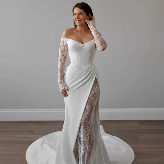 ZHUISHU Elegant Lace Long Sleeves Satin Mermiad Wedding Dress Off The Shoulder Sweep Train Graceful Vestidos De Novia Customized