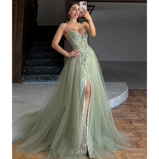 Cathy Light Green Embroidered V Neck Prom Dress Side High Split Tulle vestidos de noiva Customize A-line Floor-length Graduation