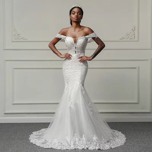 Customized Shiny Pearls Lace Mermaid Wedding Dress V-neck Off Shoulder Bridal Gown Dreamy Mermaid Dresses For Bride