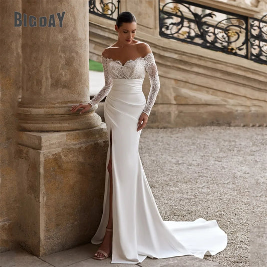 Elegant Lace Long Sleeve Mermaid Wedding Dress V-Neck Off The Shoulder Split Lace-up Bridal Gown Vestido De Noiva Customized