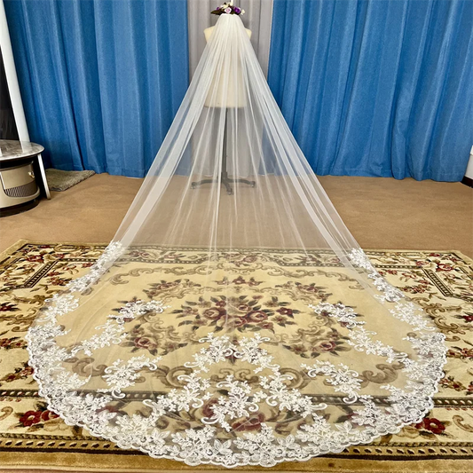 Cathedral Length One Layer Wedding Veil 3m/4m/5m with Comb White Lace Edge Bridal Veil Ivory Appliqued New Real Photo
