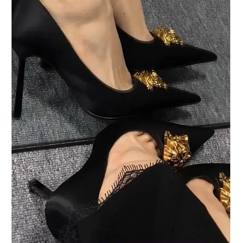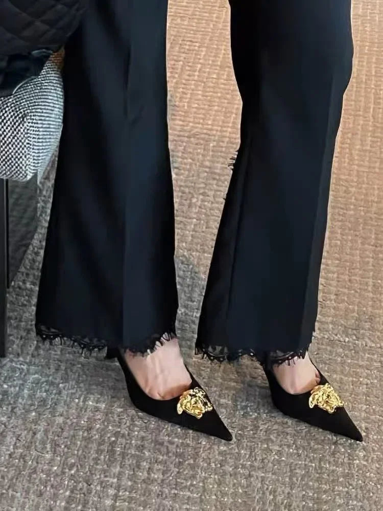 2025 Summer New Black Metal Decorative Women's Shoes with Thin Heels and Sharp Points, Non tiring High Heels