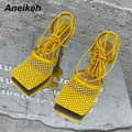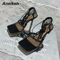 Aneikeh 2025 Summer Sexy Mesh Pumps Sandals Female Square Toe High Heel Lace Up Cross-Tied Stiletto Hollow Dress Party Shoes