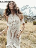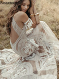 Bohemian Lace Tassel Illusion Mermaid Wedding Dresses Halter Open Back Appliques Bridal Gowns