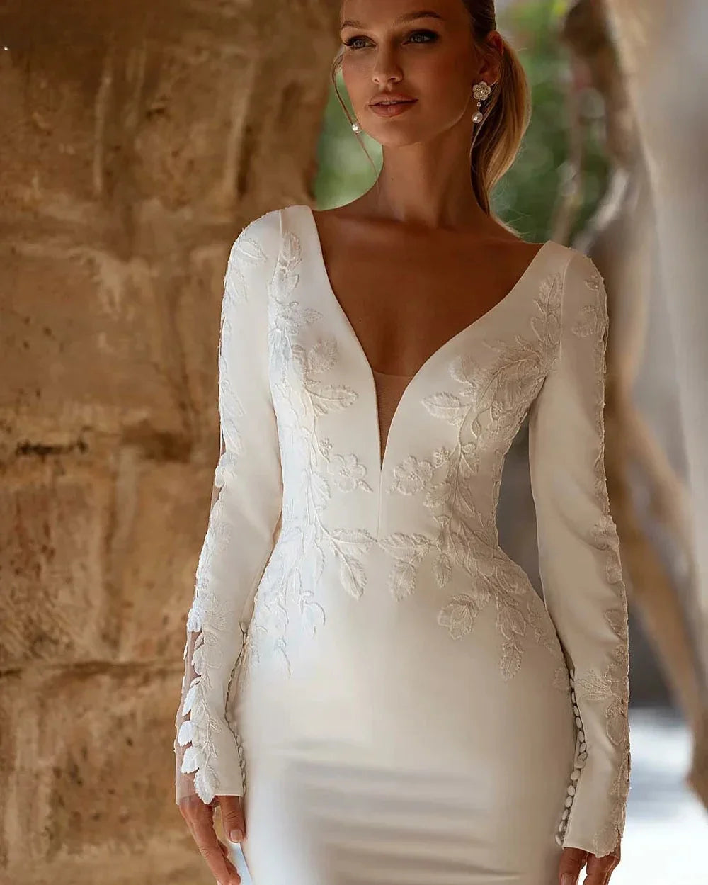 Brides adore this gown for its architectural simplicity and flawless fit. The deep neckline and long sleeves create a balance between sensuality and sophistication, making it a perfect choice for women who want a refined yet striking bridal look. Every curve is enhanced naturally, allowing the bride to feel confident, radiant, and unforgettable.