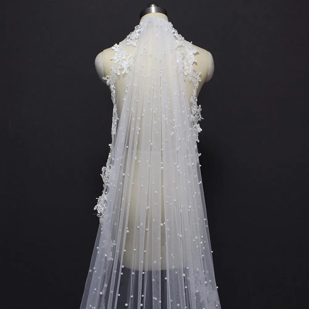 Customized High Quality Pearls Wedding Veil with Lace Appliques Edge 2.5 Meters Long Bridal Veil with Comb 250CM Veil for Bride