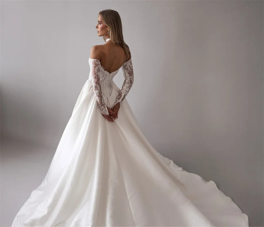Step into royal elegance with our Off-Shoulder Lace Corset Satin Wedding Dress, an extraordinary gown from Maison Bridal, crafted for the modern bride who dreams of timeless glamour, confidence, and grace.