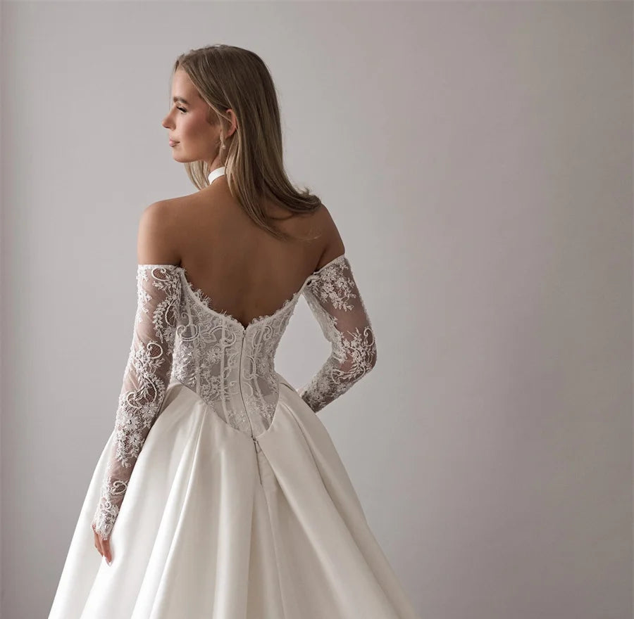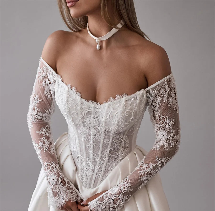This luxury ball gown features a romantic off-shoulder lace bodice with a sculpted corset waist, creating an exquisite hourglass silhouette. The delicate floral lace sleeves and the sweetheart neckline combine to evoke classic bridal romance, while the structured satin skirt adds majestic volume and contemporary sophistication.