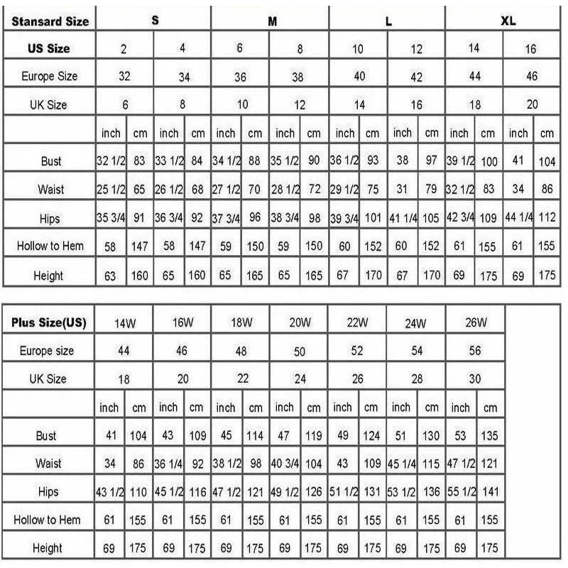 size_info: {"sizeInfoList":[{"length":{"cm":"83","inch":"32.68"},"size":"US2","vid":-91},{"length":{"cm":"84","inch":"33.07"},"size":"US4","vid":-92},{"length":{"cm":"88","inch":"34.65"},"size":"US6","vid":-93},{"length":{"cm":"90","inch":"35.43"},"size":"US8","vid":-94},{"length":{"cm":"93","inch":"36.61"},"size":"US10","vid":-95},{"length":{"cm":"97","inch":"38.19"},"size":"US12","vid":-96},{"length":{"cm":"100","inch":"39.37"},"size":"US14","vid":-97},{"length":{"cm":"104","inch":"40.94"},"size":"US16","vid":-98},{"length":{"cm":"104","inch":"40.94"},"size":"US16W","vid":-99},{"length":{"cm":"109","inch":"42.91"},"size":"US18W","vid":-100},{"length":{"cm":"114","inch":"44.88"},"size":"US20W","vid":-101},{"length":{"cm":"119","inch":"46.85"},"size":"US22W","vid":-102},{"length":{"cm":"124","inch":"48.82"},"size":"US22W","vid":-103},{"length":{"cm":"130","inch":"51.18"},"size":"US26W","vid":-104},{"length":{"cm":"135","inch":"53.15"},"size":"custom size","vid":-105}]}