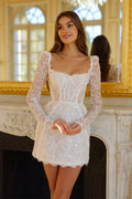 Customized Mini Skirt Square Neck Sequin Lace Wedding Dress Long Sleeves vestidos de novia Lace-up Back Short Gown After Party