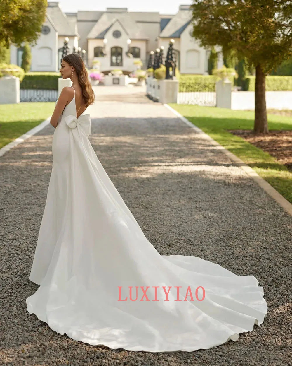 Elegant A Line Wedding Dresses Bride Satin V Neck Backless Big Bow Court Train Bride Gown Classic Bridal Dress Customized