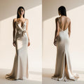Crafted from luxurious satin, it hugs the body with a fitted mermaid silhouette that flares into a dramatic chapel train — creating an unforgettable bridal look from every angle.