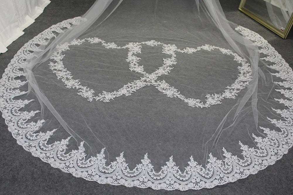 Real Photos 4 Meters Long Wedding Veil Lace Appliques Heart Pattern One Layer Bridal Veil with Comb Wedding Accessories
