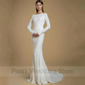 Simple Boat Neck Mermaid Wedding Dress Long Sleeve Sheath with Belt Floor Length Sweep Train Open Back Bridal Civil Gowns