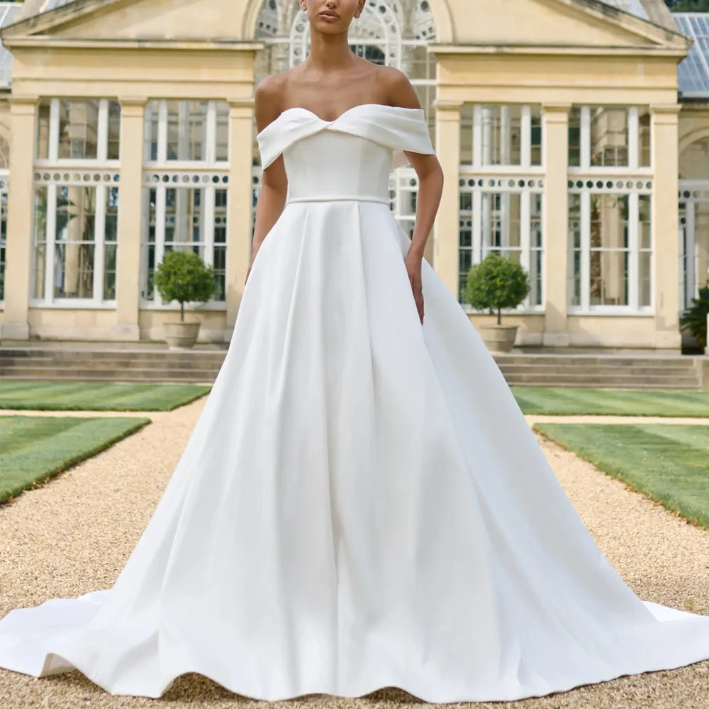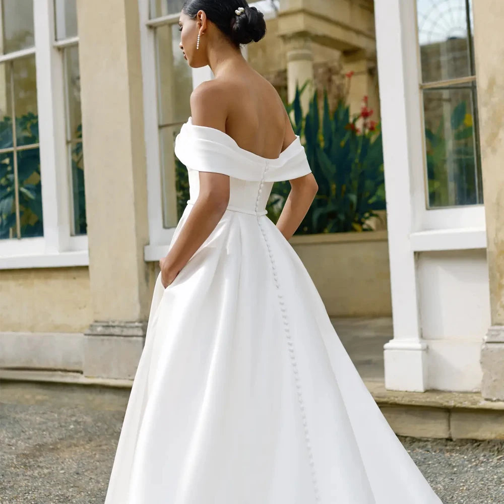 Simple Off The Shoelder Sleeves Wedding Dresses A Line Bridal Grown Zipper Back Button Customized Button Vestidos De Novia Sweep