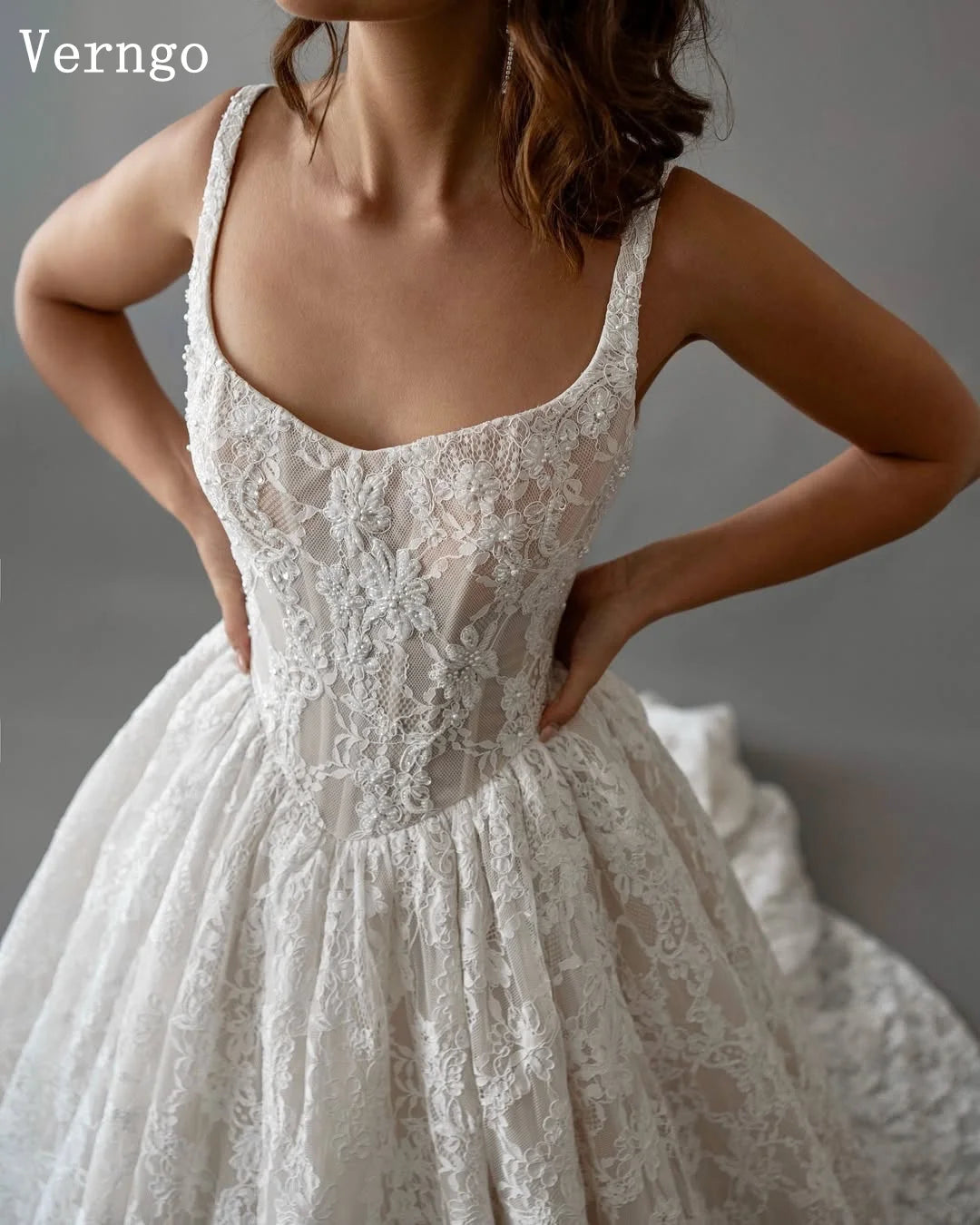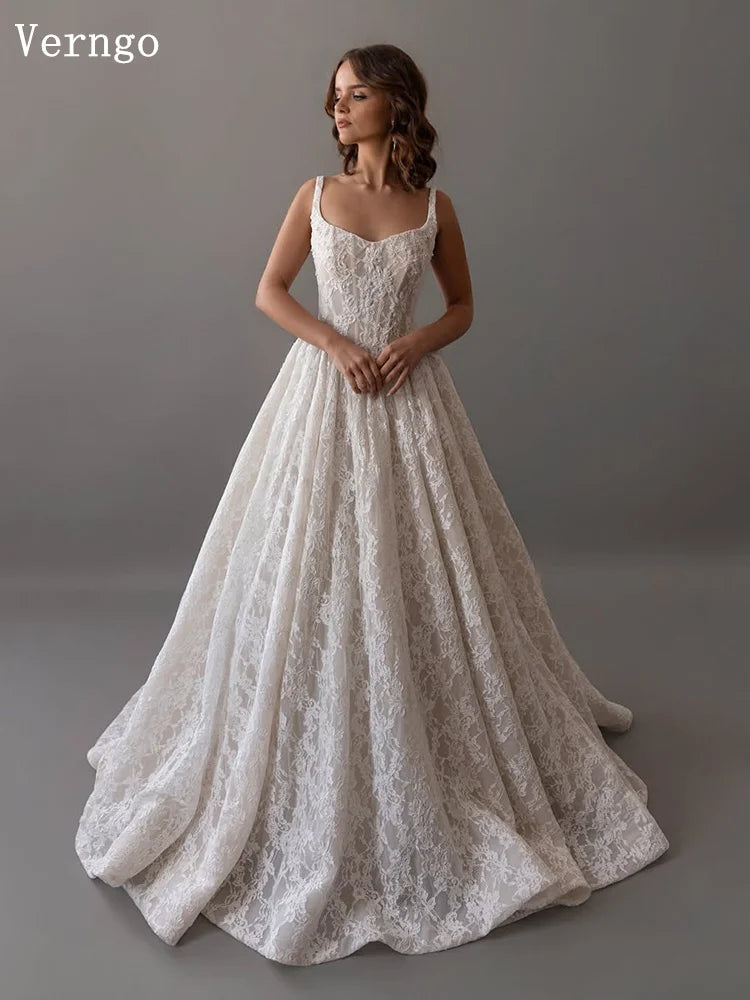 Verngo lvory Lace Bride Gowns Spaghetti Straps A Line Sweap Train Wedding Dress Luxury Elegant Bridal Dresses Customized
