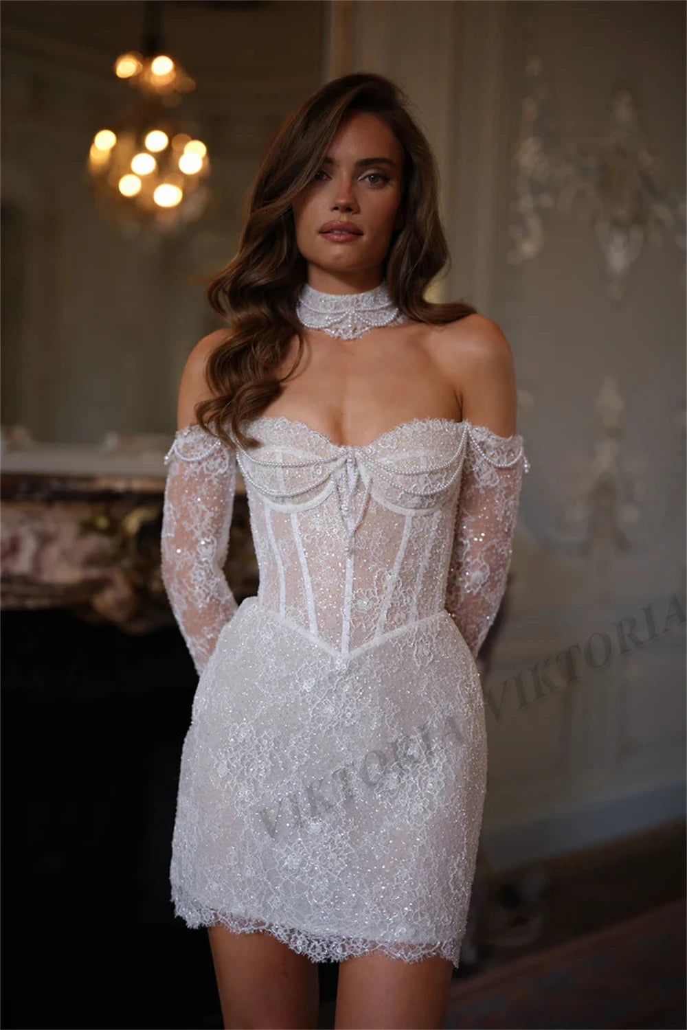 Keywords: VIKTORIA Modern Mini Wedding Party Dress For Woman Bride Sweetheart Sheath Lacing Up Lace Above Knee Robe De Mariée Custom Made