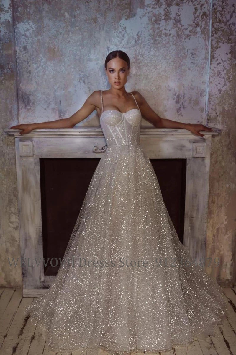 Beach Glitter Wedding Dress V Neck Party Bridal Dresses Vestido De Noiva Gelinlik Arabic mariee Shiny Bridal Gowns