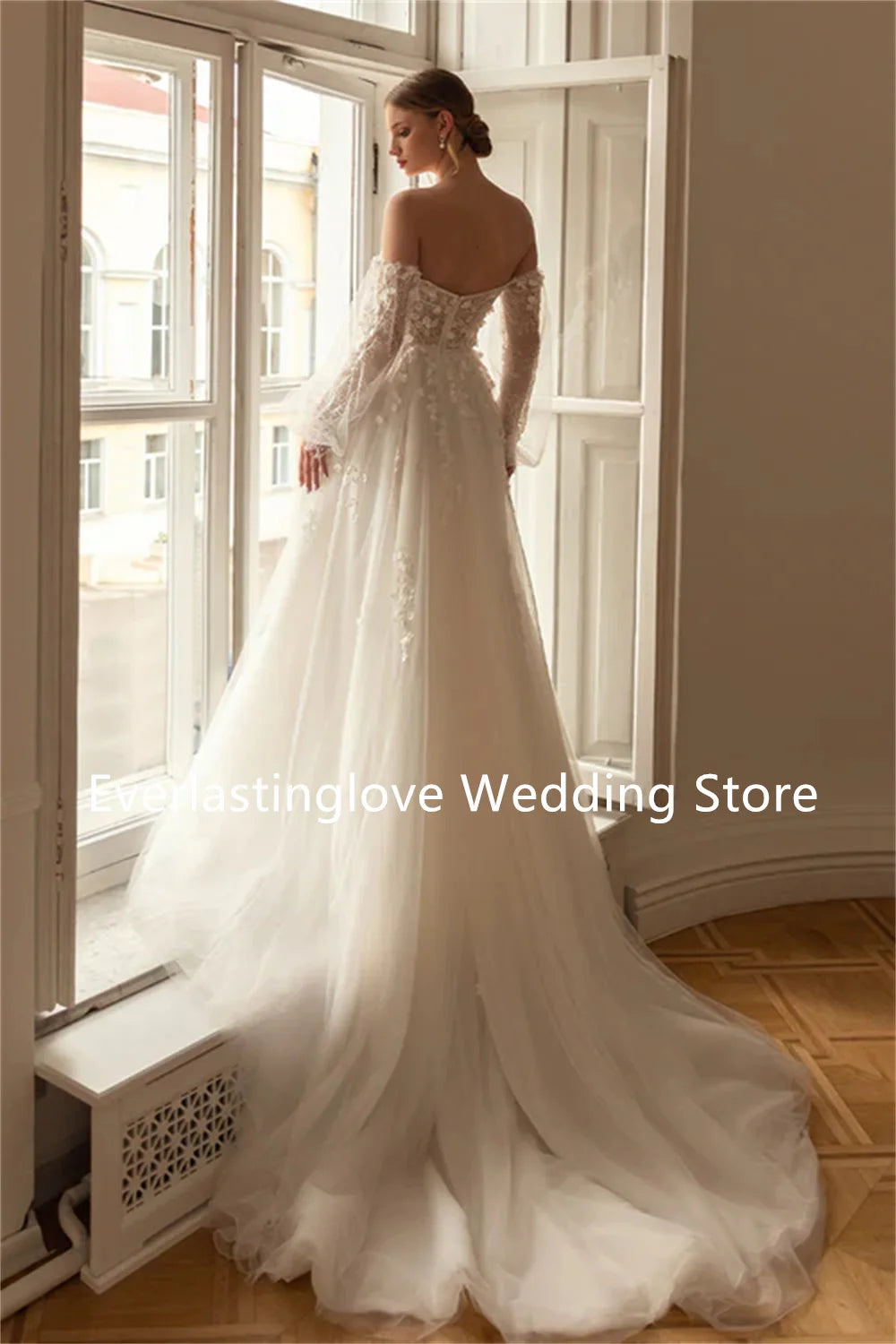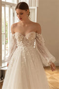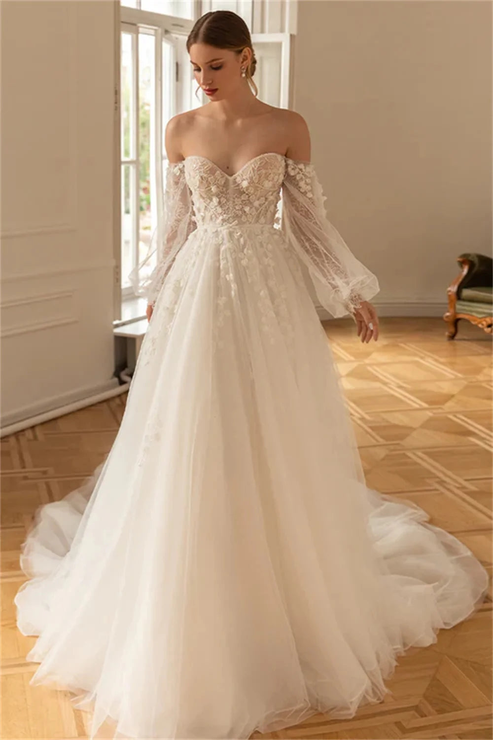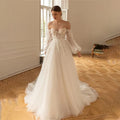Charning Long Sleeves 3D Flower Lace Applique Bridal Grown A Line Wedding Dresses Long Puff Sleeves  2026 Vestido De Noival