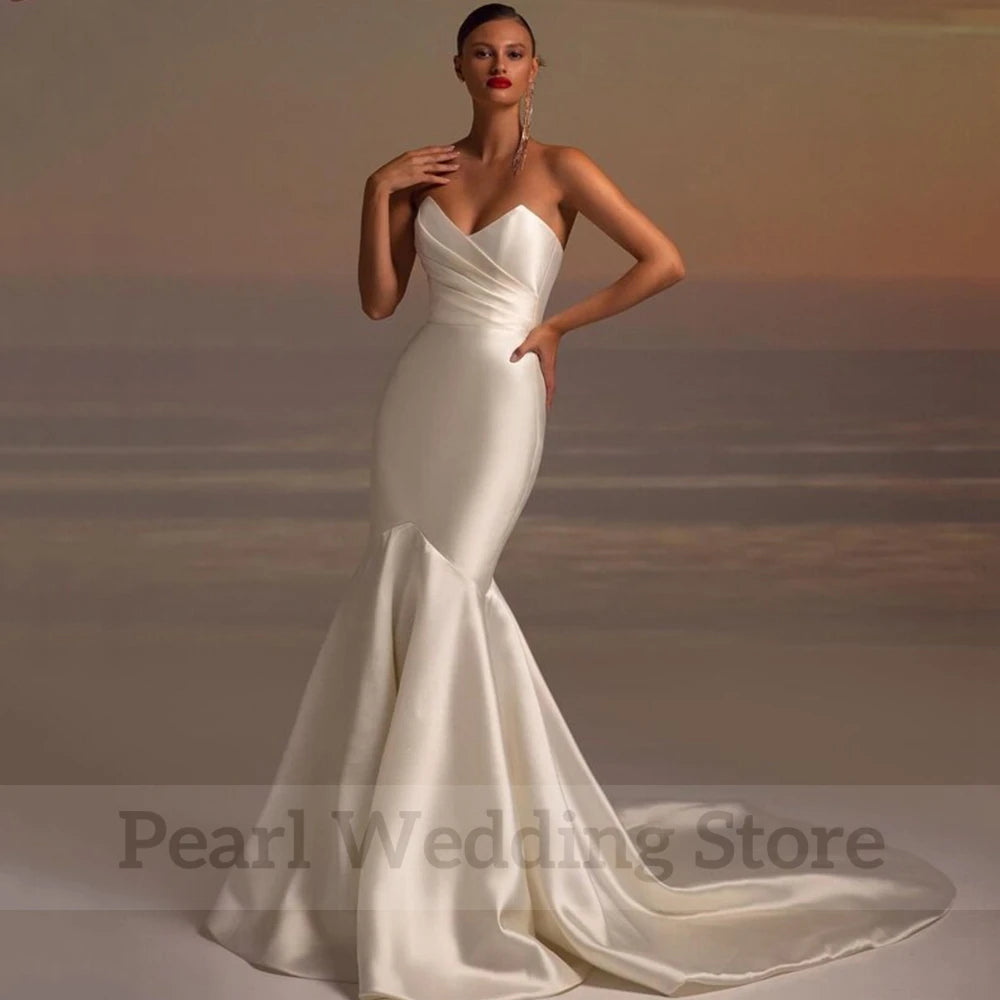 Classic Mermaid Wedding Dress Strapless V-Neck Sleeveless Satin Bride Gown Pleat Civil Marriage Dresses Princess Bridal Robe