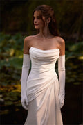 Off-Shoulder Draped Satin Wedding Dress – Elegant Mermaid Gown with Gloves & Train | Maison Bridal