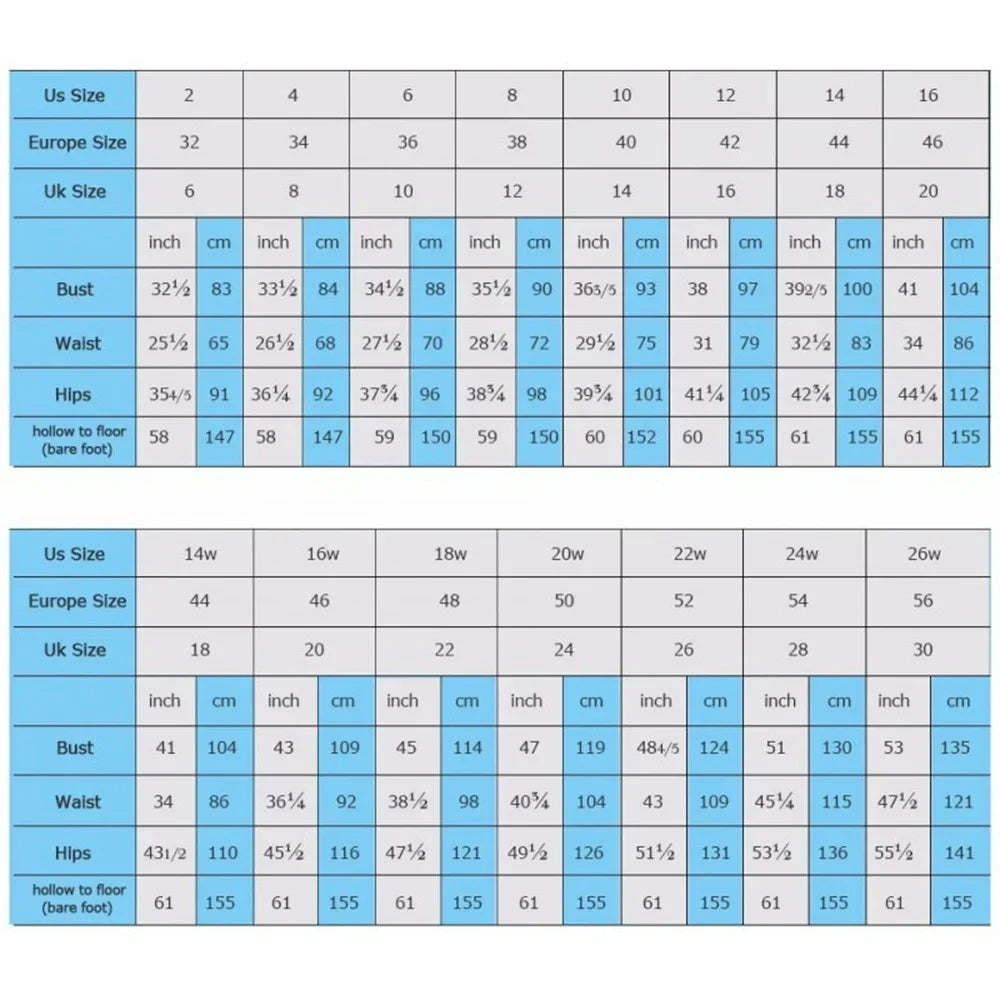 size_info: {"sizeInfoList":[{"length":{"cm":"83","inch":"32.68"},"size":"2","vid":-1},{"length":{"cm":"84","inch":"33.07"},"size":"4","vid":-2},{"length":{"cm":"88","inch":"34.65"},"size":"6","vid":-3},{"length":{"cm":"90","inch":"35.43"},"size":"8","vid":-4},{"length":{"cm":"93","inch":"36.61"},"size":"10","vid":-5},{"length":{"cm":"97","inch":"38.19"},"size":"12","vid":-6},{"length":{"cm":"100","inch":"39.37"},"size":"14","vid":-7},{"length":{"cm":"104","inch":"40.94"},"size":"16","vid":-8},{"length":{"cm":"109","inch":"42.91"},"size":"16W","vid":-9},{"length":{"cm":"114","inch":"44.88"},"size":"18W","vid":-10},{"length":{"cm":"119","inch":"46.85"},"size":"20W","vid":-11},{"length":{"cm":"124","inch":"48.82"},"size":"22W","vid":-12},{"length":{"cm":"130","inch":"51.18"},"size":"24W","vid":-13},{"length":{"cm":"135","inch":"53.15"},"size":"26W","vid":-14},{"length":{"cm":"104","inch":"40.94"},"size":"14W","vid":-15},{"length":{"cm":"/","inch":"/"},"size":"定制尺码","vid":-16}]}