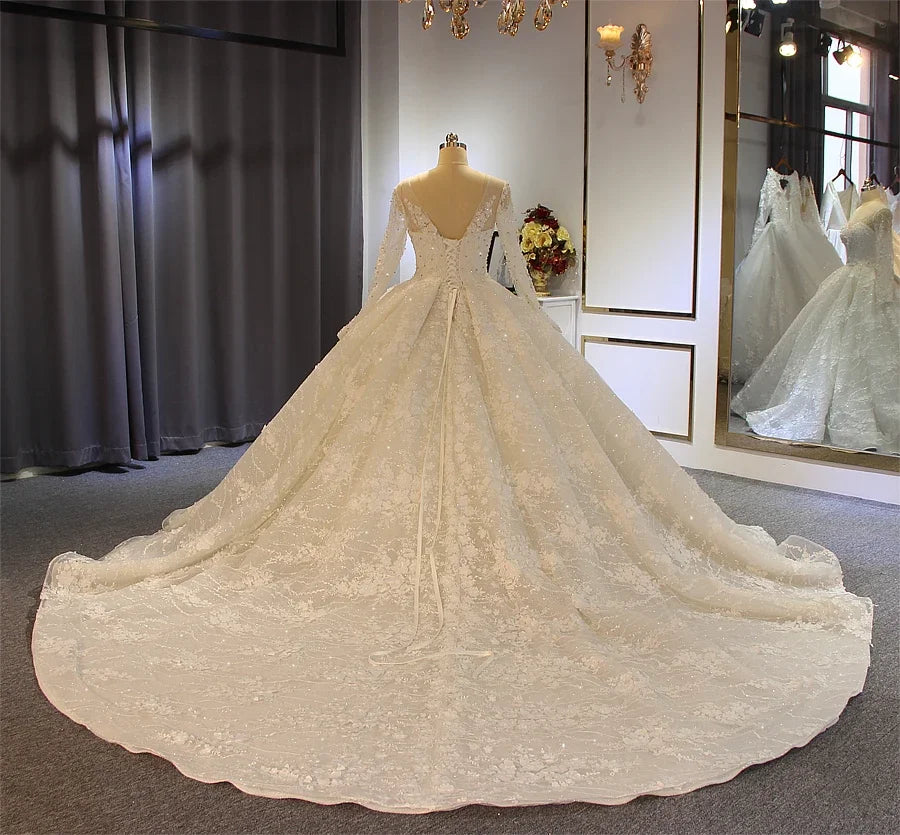 Customized Luxury Lace applique pearls wedding dresses Ball Gown Long Sleeves Shinny Wedding Dress Amanda Novias 2025
