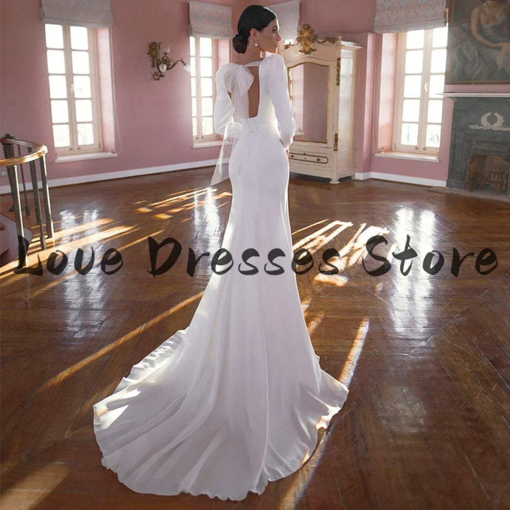 Customized Simple Long Sleeve Mermaid Jersey Wedding Dress Women Elegant and Chic Square Neck Court Train Pure White Bridal Gown