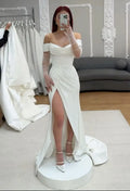 Elegant Off The Shoulder Pleat Sweetheart Satin Sheath Wedding Dresses Side Slit Detachable Train 2 In 1 Rode De Morrie