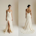 Women’s Ivory Satin Wedding Dress – Spaghetti Straps, V-Neck, Open Low Back, Front Slit, Sweep Train – Maison Bridal