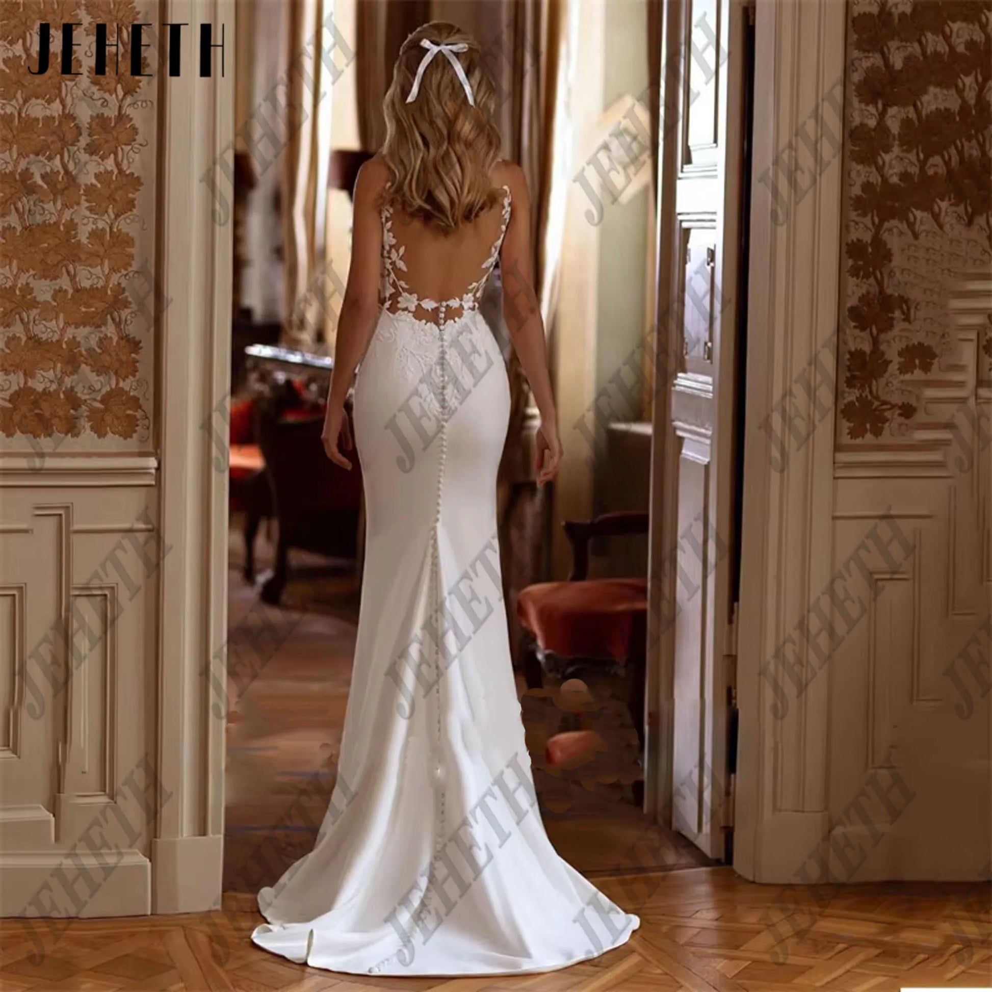 JEHETH Elegant Mermaid Wedding Dresses Women Open Back V-Neck Lace Spaghetti Straps Bridal Gown Vestidos De Novia Customized