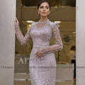 Luxury Dresses for Party Satin Sheath/Column Celebrity Dress Taro Pur High Collar Beads Side Split Evening Dress Long 2025