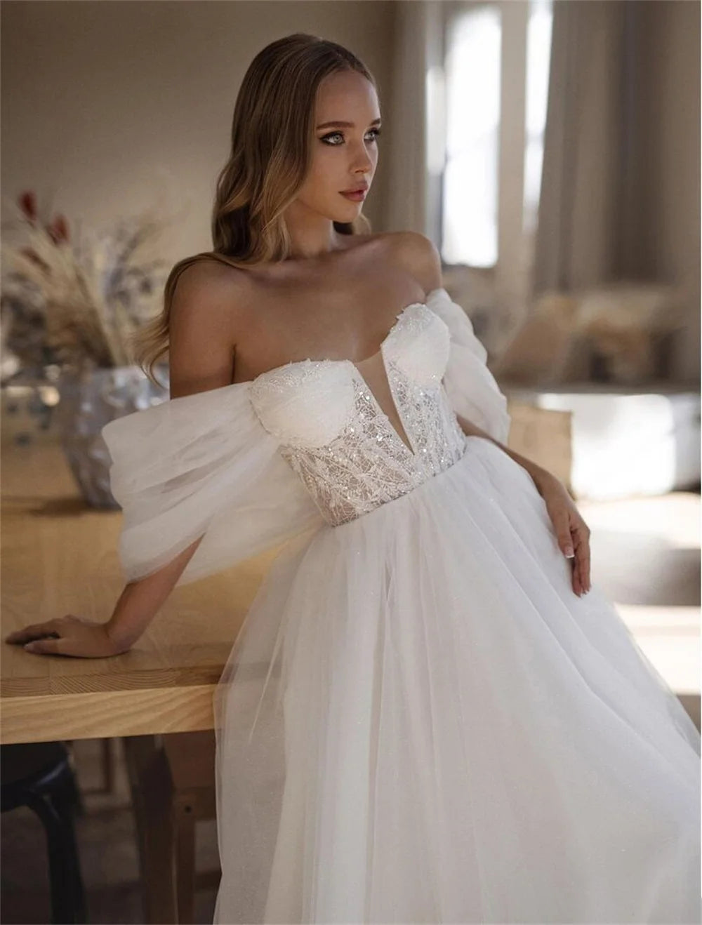 Luxury Off-the-Shoulder Sweetheart Neckline A-Line Dress - Handmade Lace Applique Wedding Gown"