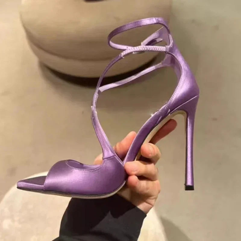 Luxury Satin Designer Women Pumps Sexy Cross Strap Square Toe Heeled Sandals Elegant Purple Thin High Heels Party Dress Shoes