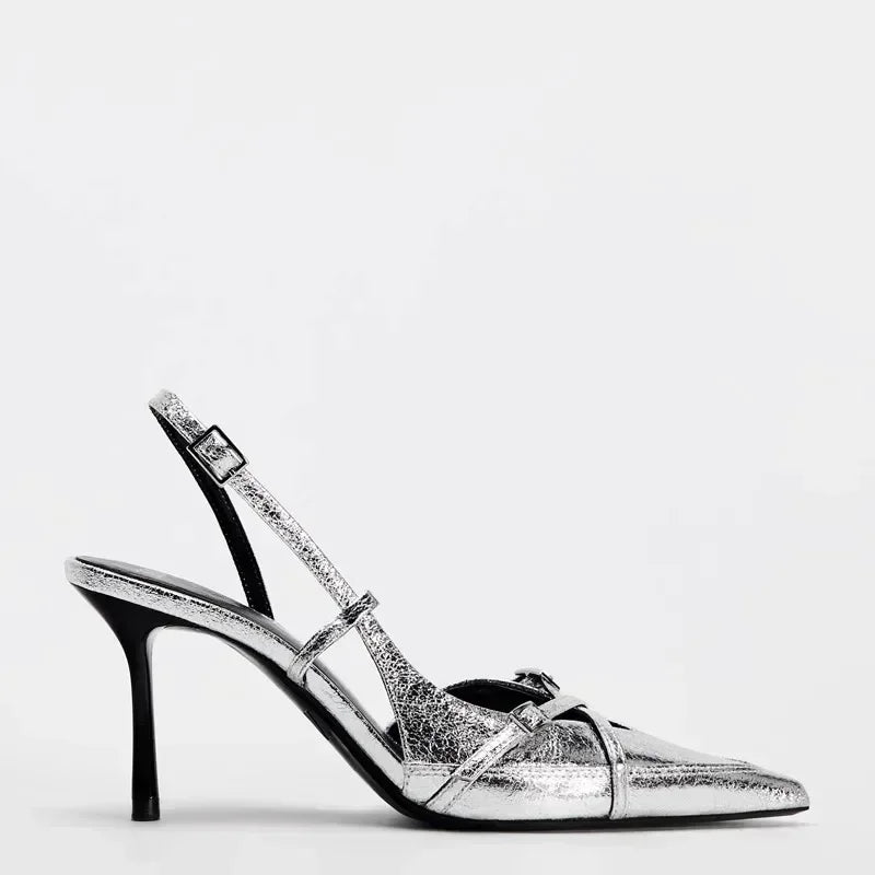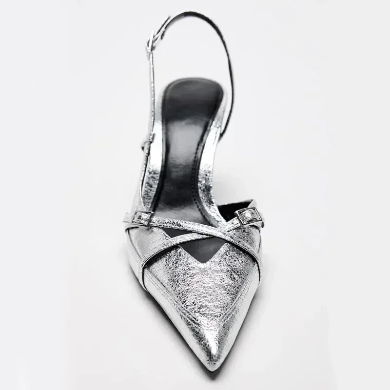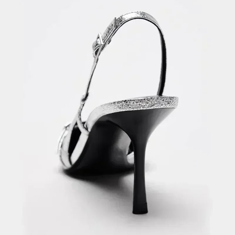 Luxury Silver Mules High Heels Women Sexy Pointed Toe Slingbacks Thin High Heels Sandals Elegant Metal Buckle Design Women Pumps