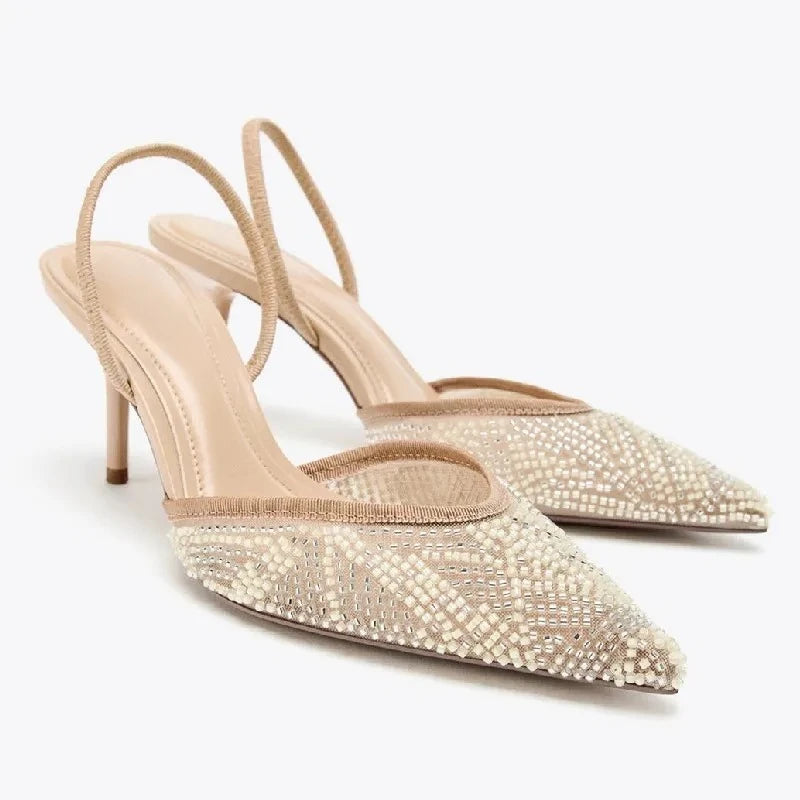 Luxury String Bead Design Brand High Heels Women Fashion Pointy Toe Slingback High Heeled Sandals Elegant Wedding Bridal Shoes