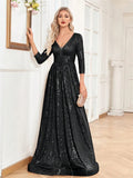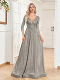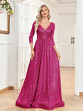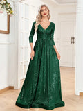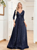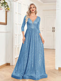 Luxury V Neck Long Sleeves Blue Sequins Formal Evening Dress Women 2025 Wedding Party Prom Maxi Cocktail Dress Gowns