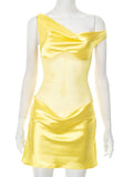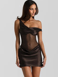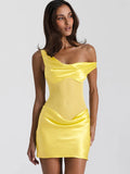 Oniflyme Mesh Patchwork Satin Mini Dress Women Inclined Shoulder Backless Ruched Slim Party Outfits Sleeveless Bodycon Dresses