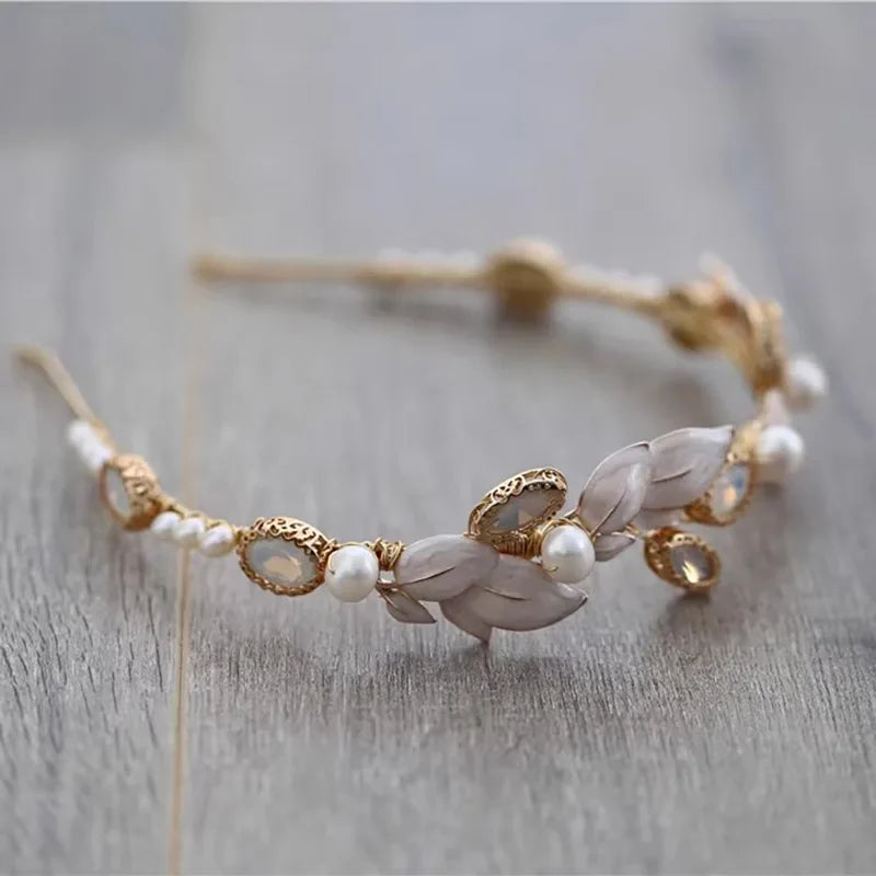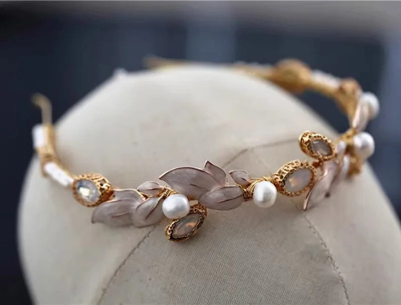 Opal Crystal Wedding Tiara Bridal Hair Crown Freshwater Pearls Jewelry Women Hairband Gold Color
