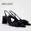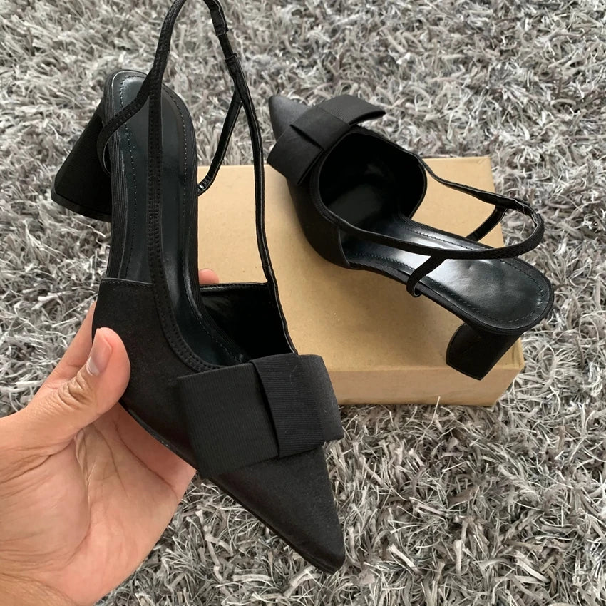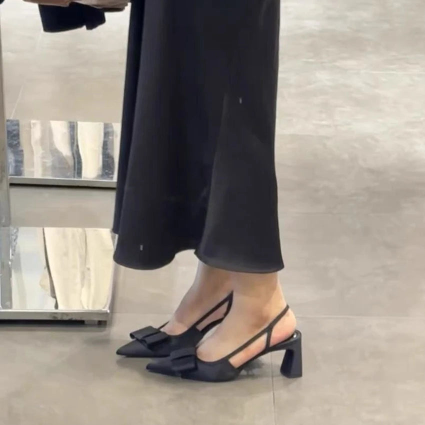 Pointed Toe Women's Office Shoes 2025 Summer Black Retro Bow Decoration High Heels Shallow Slingbacks Elegant Ladies Pumps