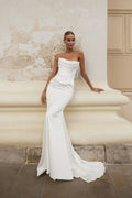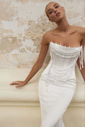 Pearl Corset Wedding Dress – Elegant Strapless Satin Bridal Gown with Draped Bodice & Train | Maison Bridal