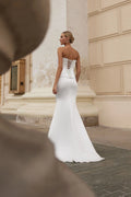 The luxurious satin skirt flows gracefully into a long chapel train, creating a sleek and regal silhouette perfect for any ceremony setting.