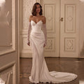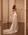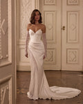 The semi-sheer lace sleeves add a touch of artistry and allure, perfectly balanced by the sleek, fluid train that glides beautifully as you walk down the aisle. Every seam and contour is crafted to celebrate the female form — a perfect harmony of strength, softness, and elegance.