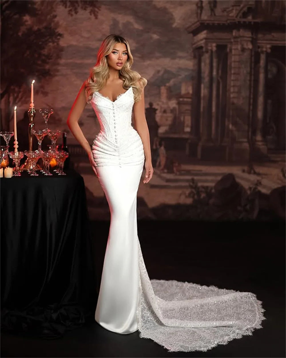 Sexy V-neck Lace Applique Sheath Wedding Dresses Sweep Train Custom Made 2026 Vestido De Noival