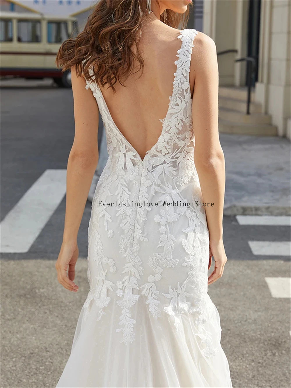 Sexy V-neck Two Straps Lace Applique Bridap Grown Mermaid Wedding Dresses Backless Sweep Train Custom Made 2026 Rode De Morrie