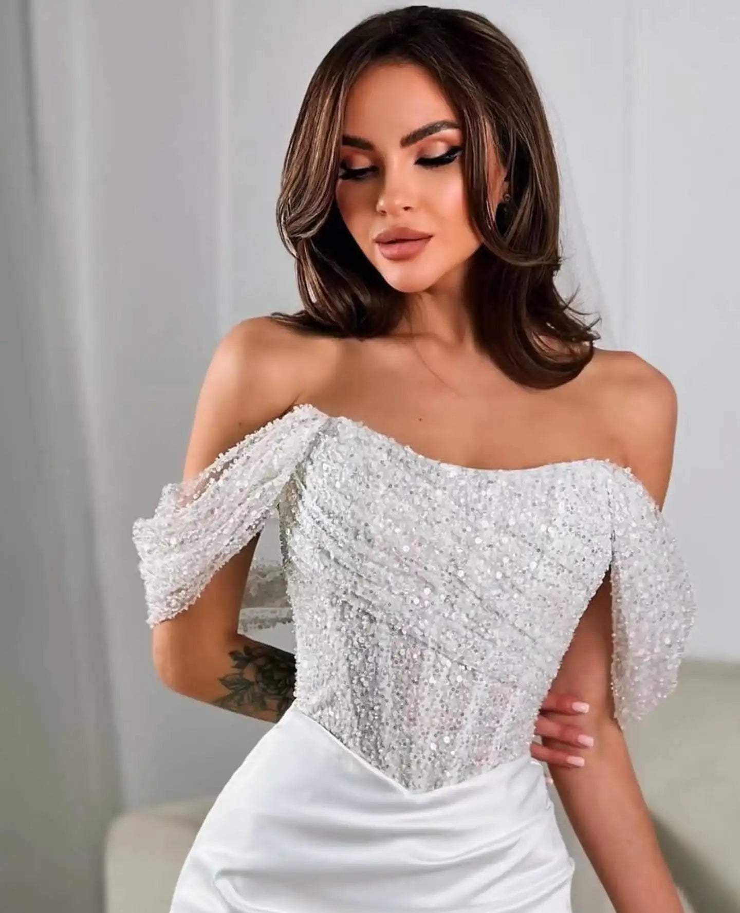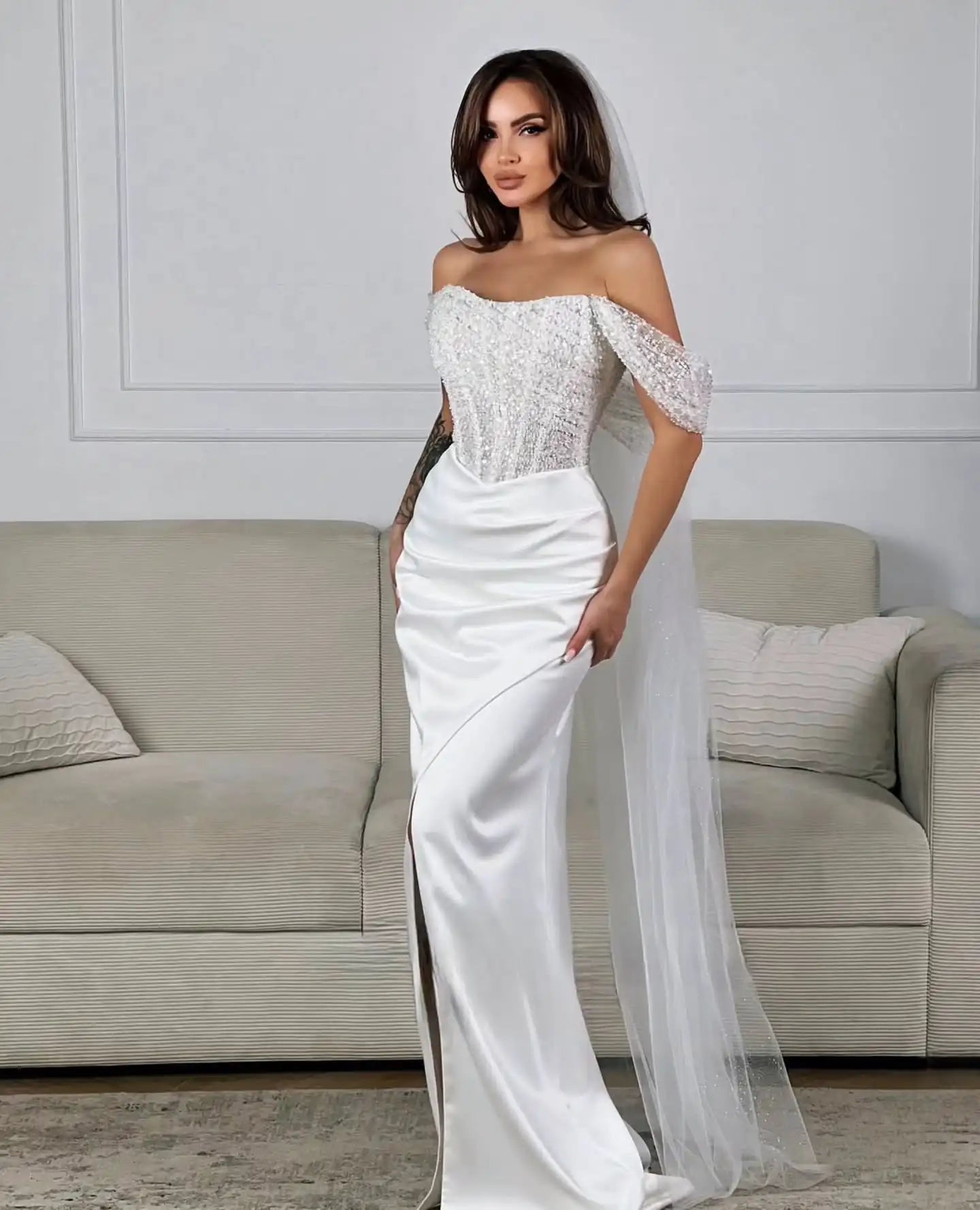 Shiny Beaded Sequined Sweetheart  Satin Sheath Wedding Dresses Side Slit  Corset Custom Made 2026 Vestido De Noival